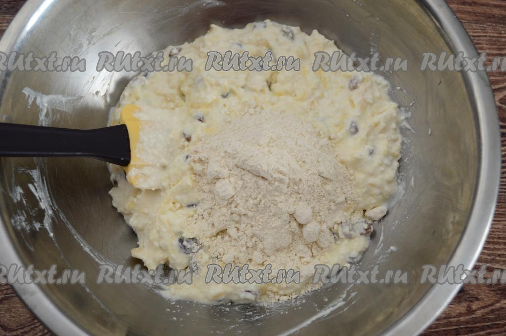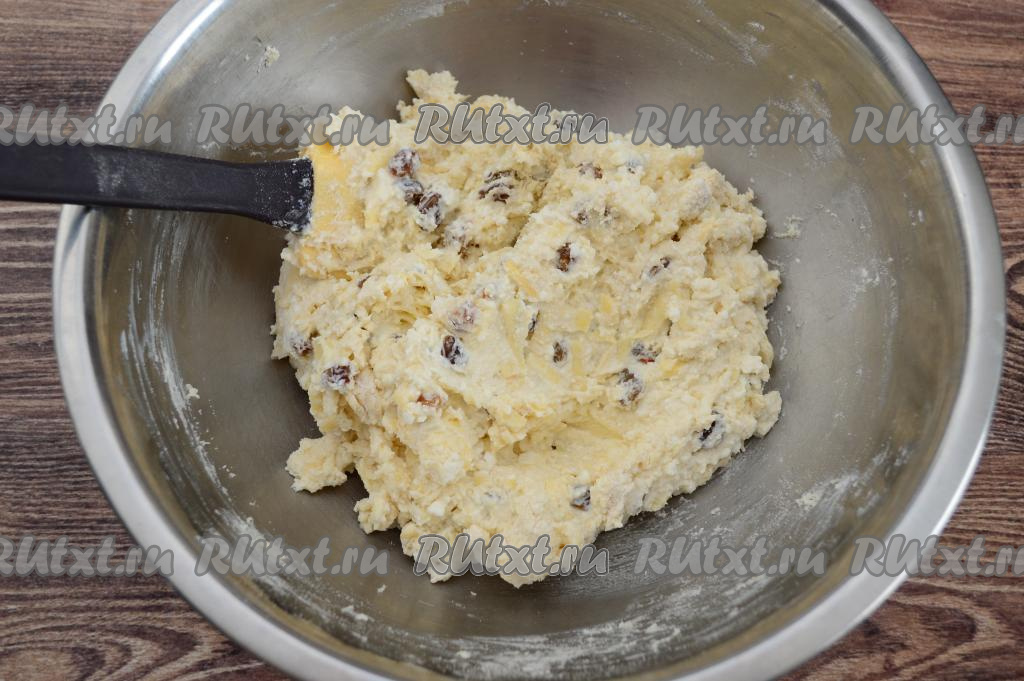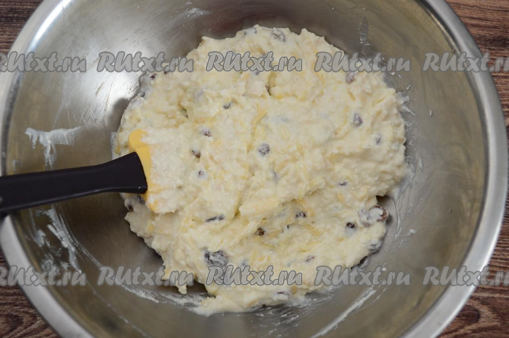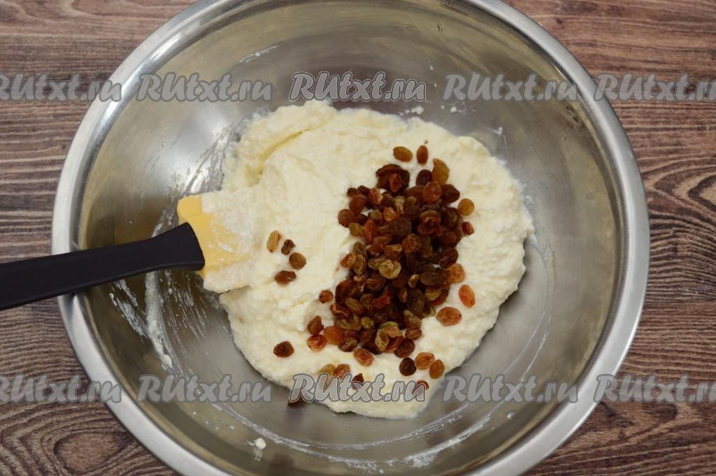 В миску с творожной массой всыпать обсушенный изюм.