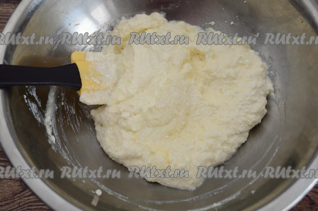 А затем перемешать творожную массу до однородности с помощью лопатки.