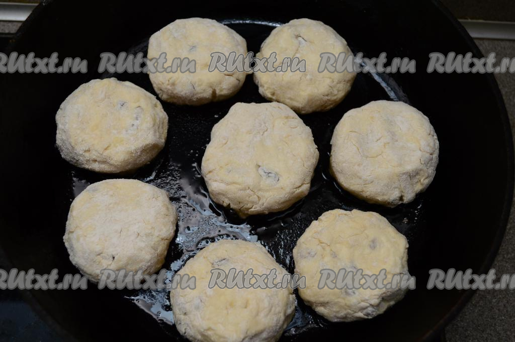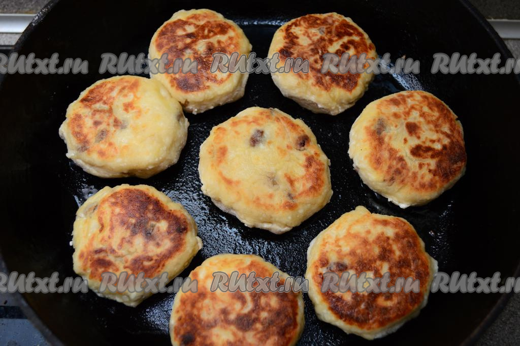 В сковороду влить растительное масло, хорошо его разогреть, затем выложить заготовки сырников с яблоком и изюмом. Жарить их на среднем огне минуты 3-4 (до подрумянивания снизу).