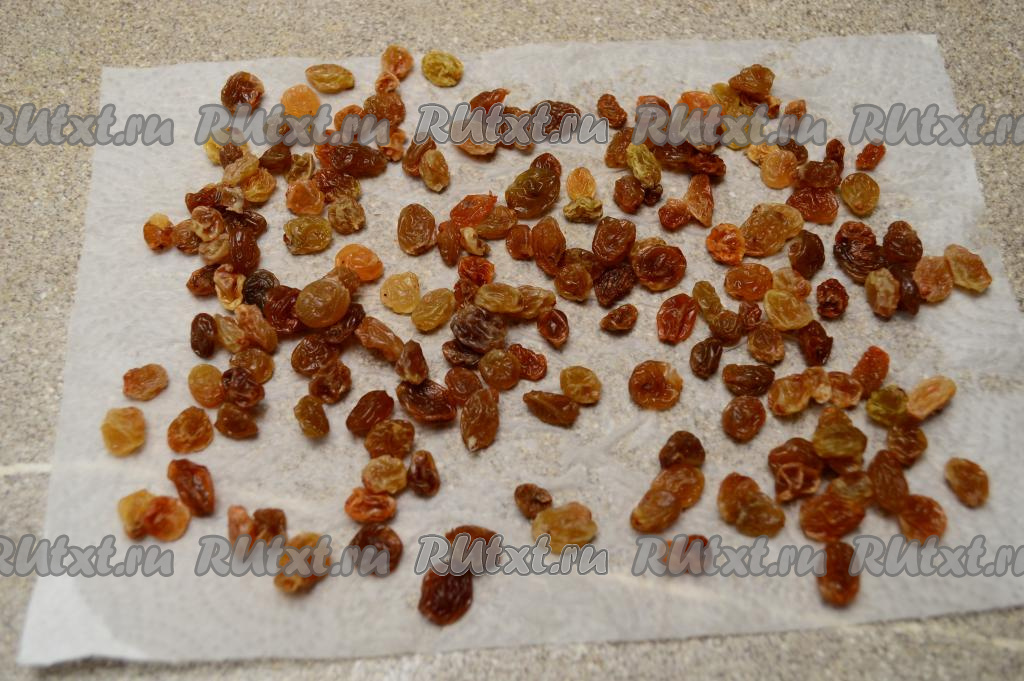 Первым делом изюм поместить в сито, промыть проточной водой. После этого выложить изюм в небольшую ёмкость, залить полностью кипящей водой, оставить на 4-5 минут. Затем откинуть изюм на сито. После того как вода с изюма стечёт, разложить его на бумажном полотенце, дать обсохнуть. Осмотреть изюм, чтобы не было остатков веточек.