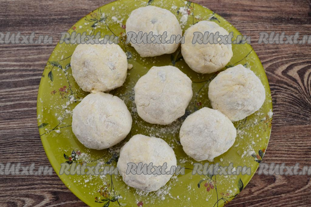 Зрительно разделить получившееся творожное тесто на равные части (я разделила на 8 частей). Руками, слегка смоченными водой, из каждой части теста сформировать круглый сырник. Заранее в достаточно глубокую тарелку насыпать 2 столовых ложки муки. Каждый сформированный сырник сразу выкладывать на тарелку и обваливать в муке со всех сторон.