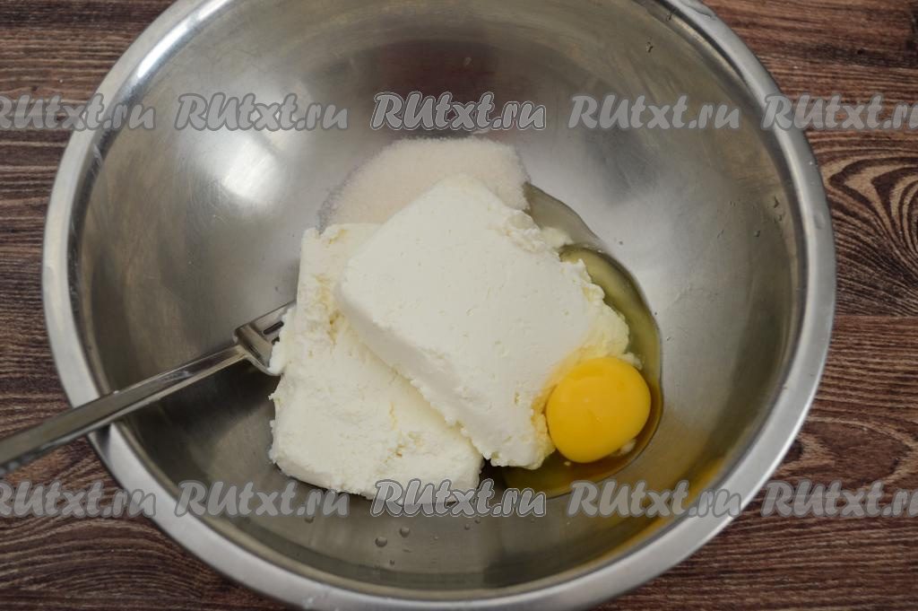 Пока обсыхает изюм, займёмся тестом для сырников. Для этого в достаточной объёмной миске нужно соединить сырое яйцо, сахар и творог, сначала растереть массу вилкой.
