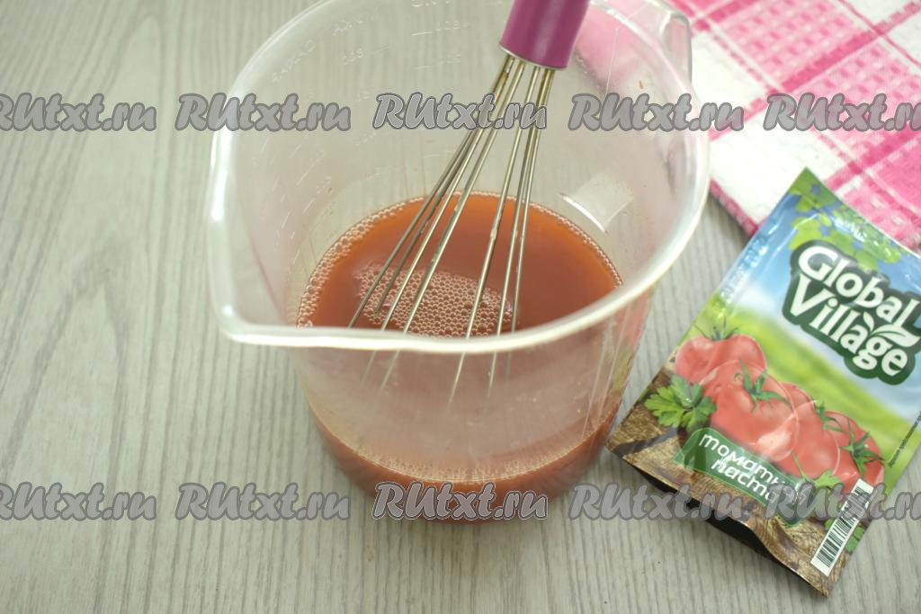 Пока обжариваются фрикадельки, в достаточно глубокую ёмкость выкладываем томатную пасту, вливаем 300 миллилитров тёплой воды, перемешиваем. Солим получившийся томатный соус, по желанию, можно добавить в него чёрный молотый перец.