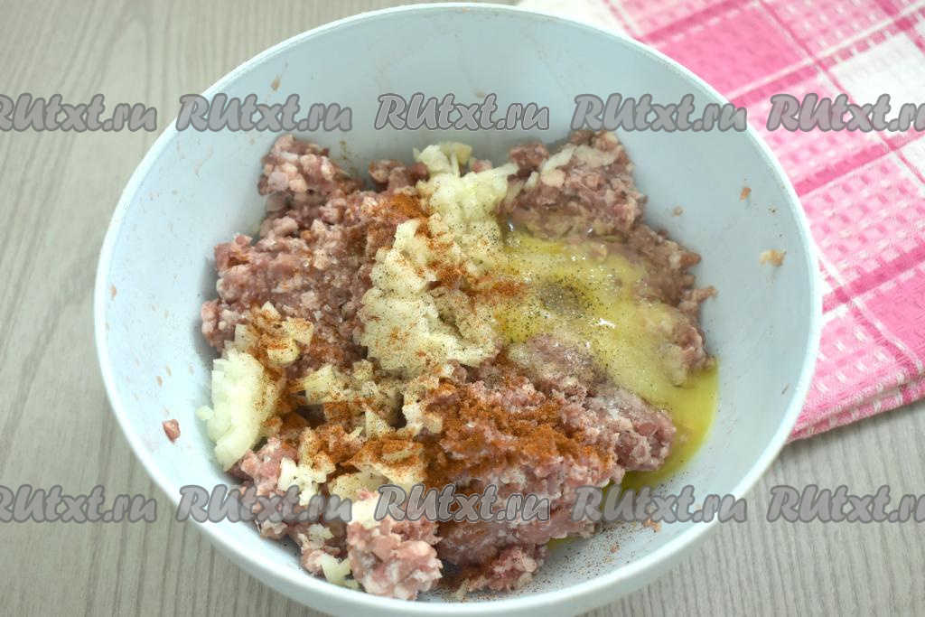 К фаршу с луком добавляем сырое яйцо, соль и специи (в качестве специй я добавила паприку и чёрный молотый перец).