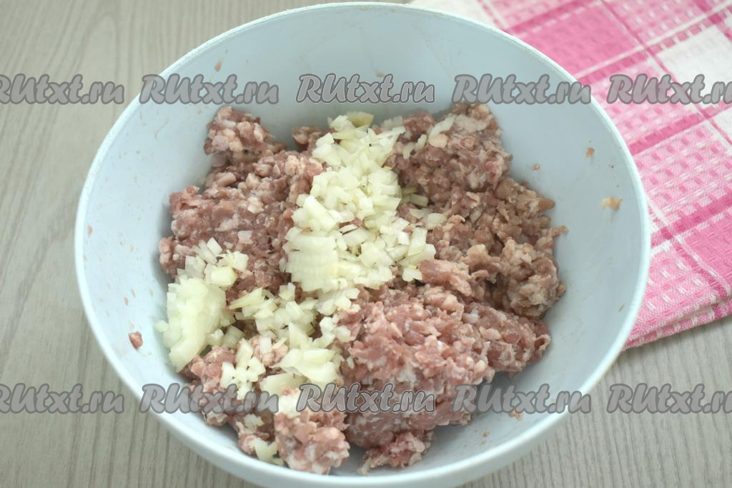 Очищенный лук мелко нарезаем (или пропускаем через мясорубку), выкладываем в миску с фаршем.
