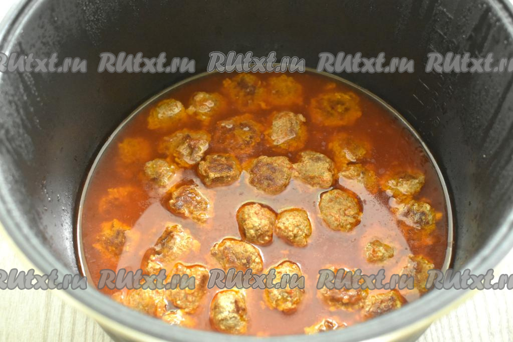 Обжаренные фрикадельки заливаем получившимся томатным соусом, закрываем крышку мультиварки.