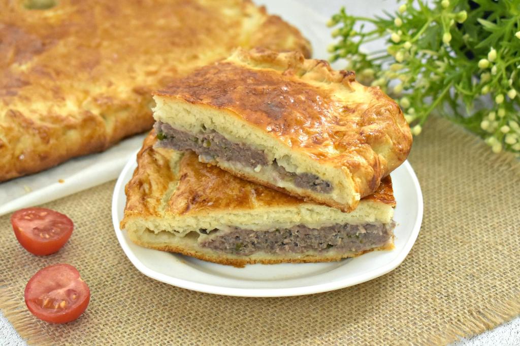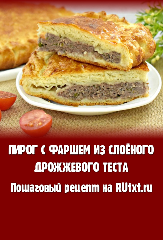 Аппетитный, сытный, вкусный, пирог с фаршем, приготовленный из слоёного дрожжевого теста, достаём из духовки, даём немного остыть, а после этого его можно нарезать на части и подавать к столу.