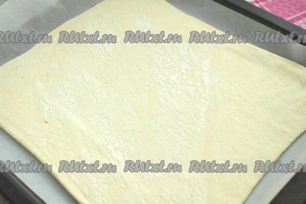 У меня слоёное тесто было в 2 пластах. Вначале один пласт размороженного слоёного теста выкладываем на стол, присыпанный мукой, раскатываем в квадрат со стороной 26 сантиметров. Сразу раскатанный пласт слоёного теста помещаем на противень, застеленный листом для выпечки (или пергаментом).