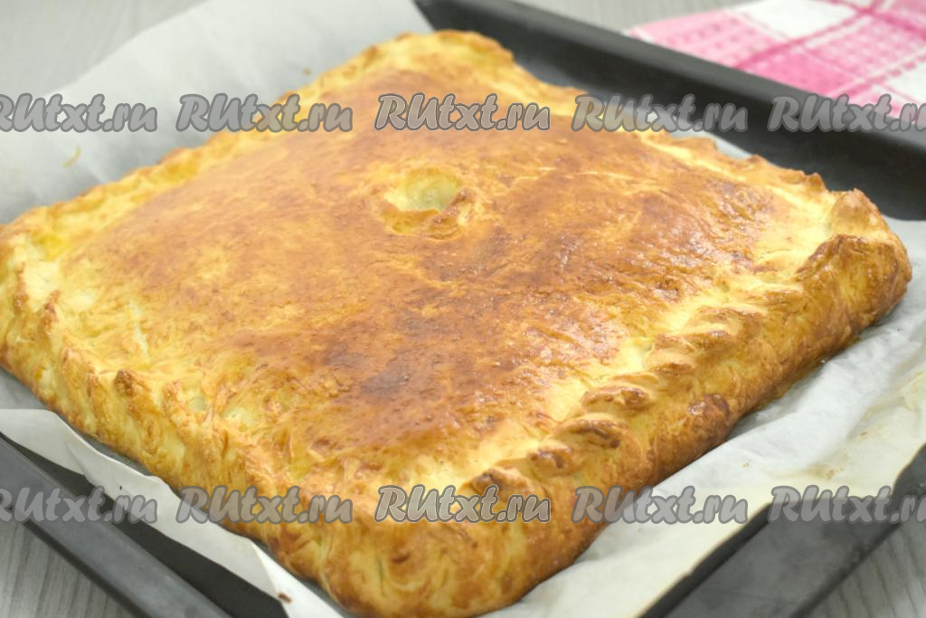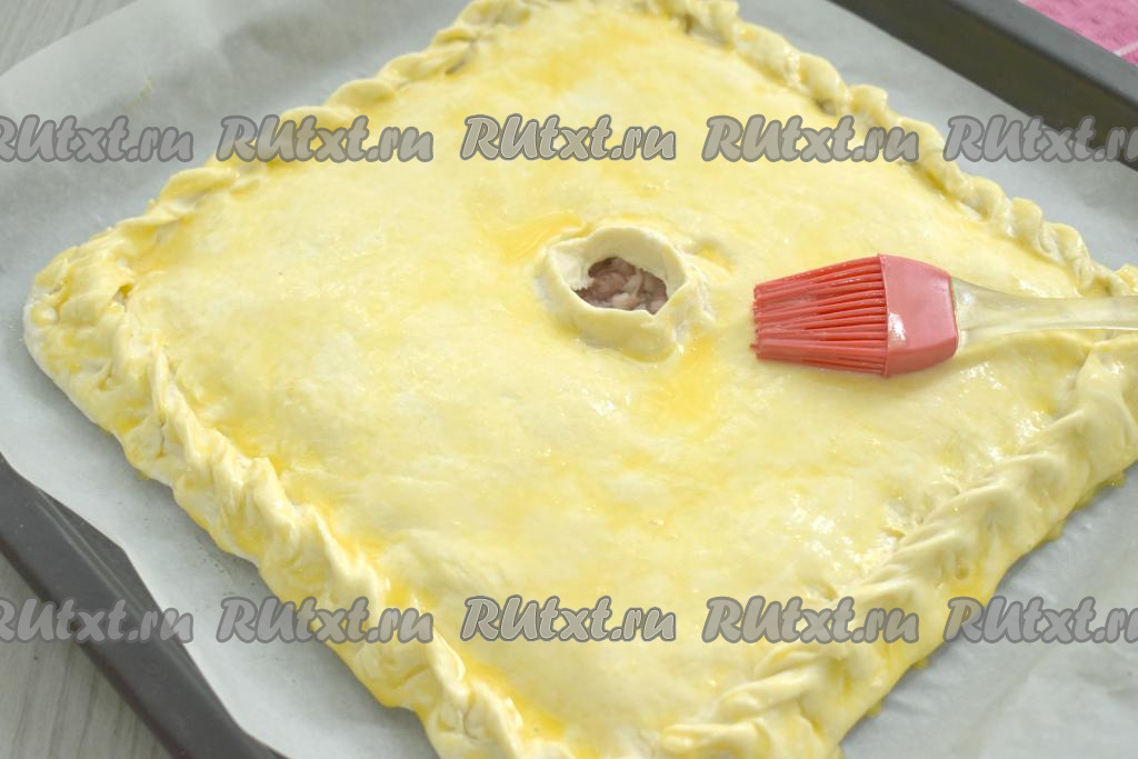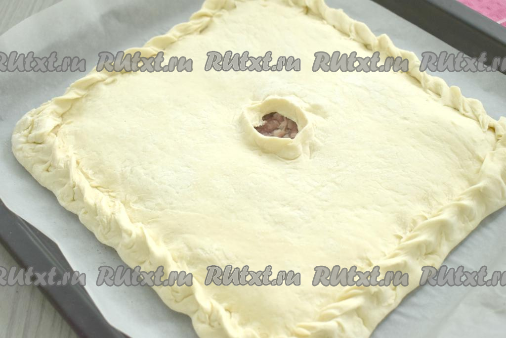 Затем второй пласт теста на присыпанной мукой поверхности раскатываем в квадрат со стороной 24 сантиметра. Тесто с начинкой накрываем вторым раскатанным пластом теста, тщательно скрепляем края пирога. В центре верхнего пласта теста делаем отверстие для выхода пара.