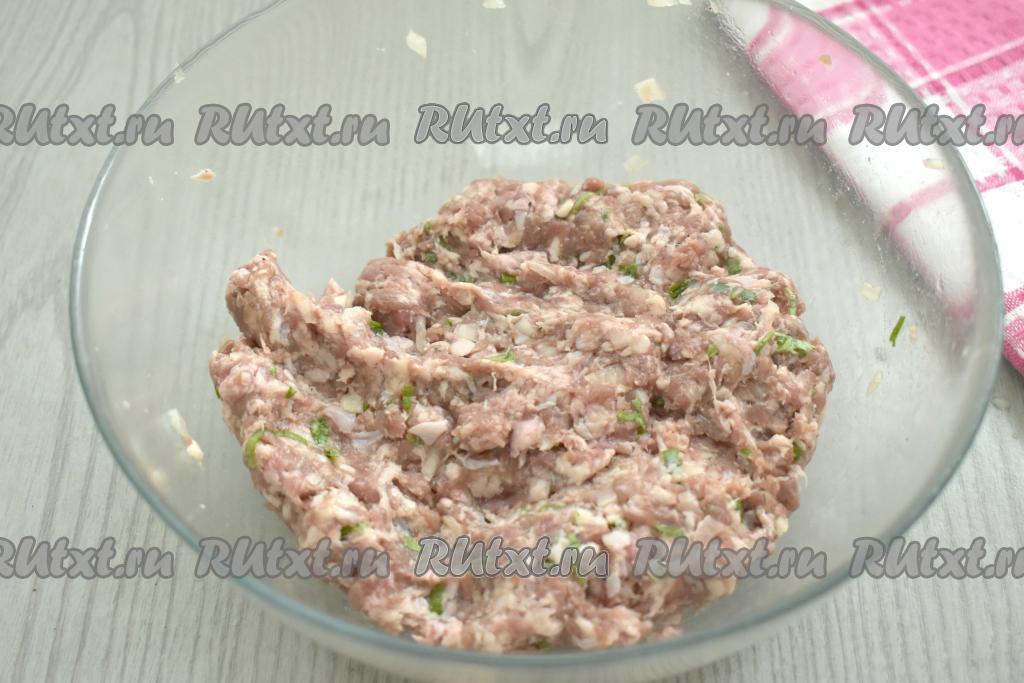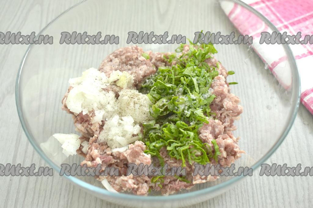 Выкладываем фарш в миску, добавляем мелко нарезанный (или пропущенный через мясорубку) лук, нарезанную зелень, по вкусу солим и перчим.