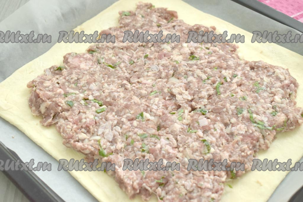 Отступив от краёв теста по 2 сантиметра, равномерно выкладываем фарш.
