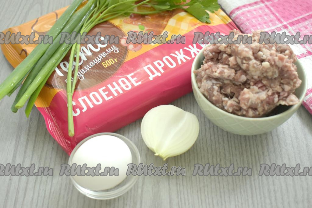 Подготовим продукты. Слоёное дрожжевое тесто заранее достаём из морозилки и оставляем оттаивать при комнатной температуре. Тесто должно стать мягким. Очищаем лук. Свежую зелень (у меня - петрушка и зелёный лук) моем, немного обсушиваем. Фарш можно взять любой (например, свиной, говяжий, куриный или из нескольких видов мяса). Я приготовила фарш в домашних условиях, пропустив кусочки свинины через мясорубку.