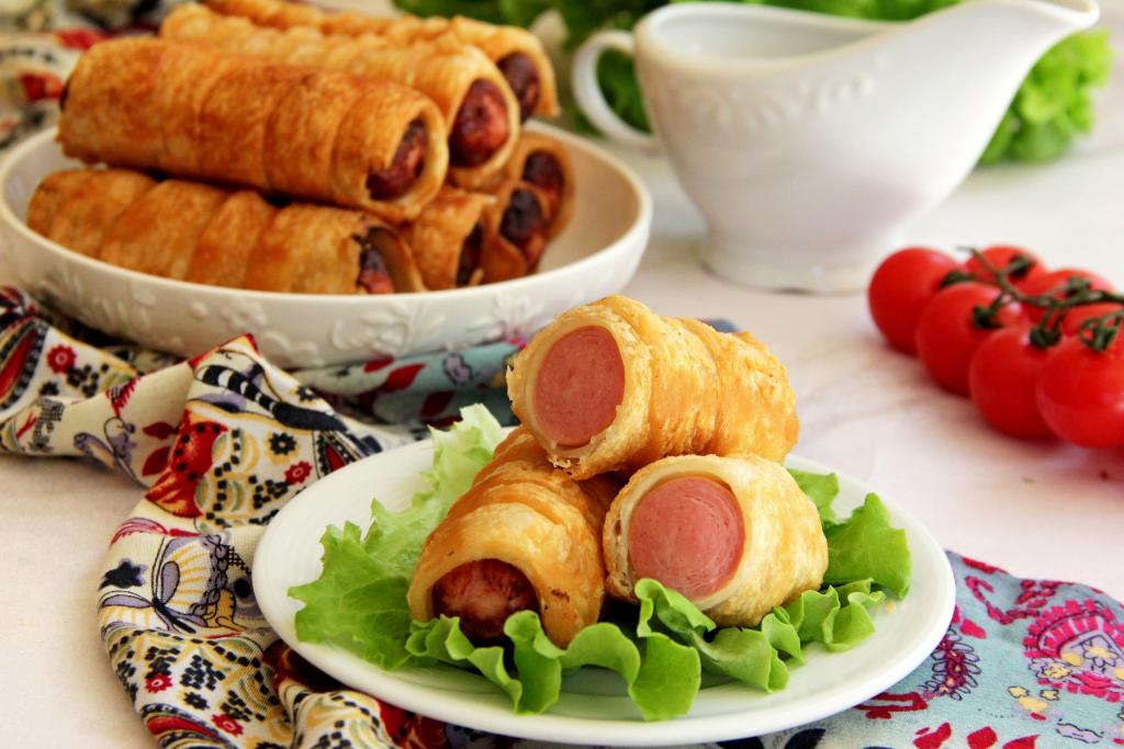 Аппетитные сосиски в слоёном бездрожжевом тесте, жаренные на сковороде, можно есть и тёплыми, и остывшими. Их можно подать к чаю, брать с собой на работу в качестве перекуса или давать детям в школу.