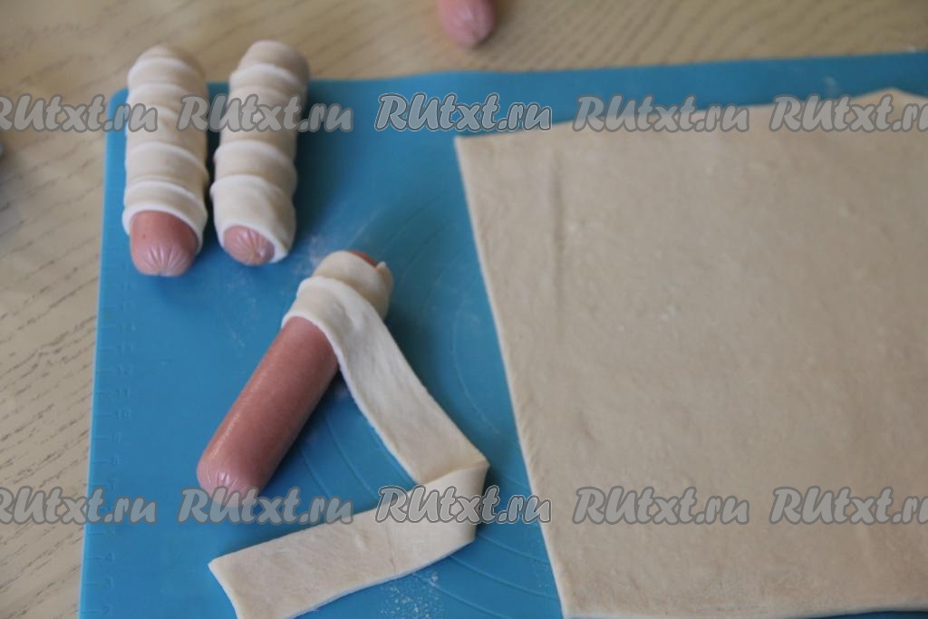 Каждую сосиску обернуть в полоску теста внахлёст, слегка растягивая тесто. После того как вся сосиска будет обёрнута в тесто, край полоски нужно закрепить.