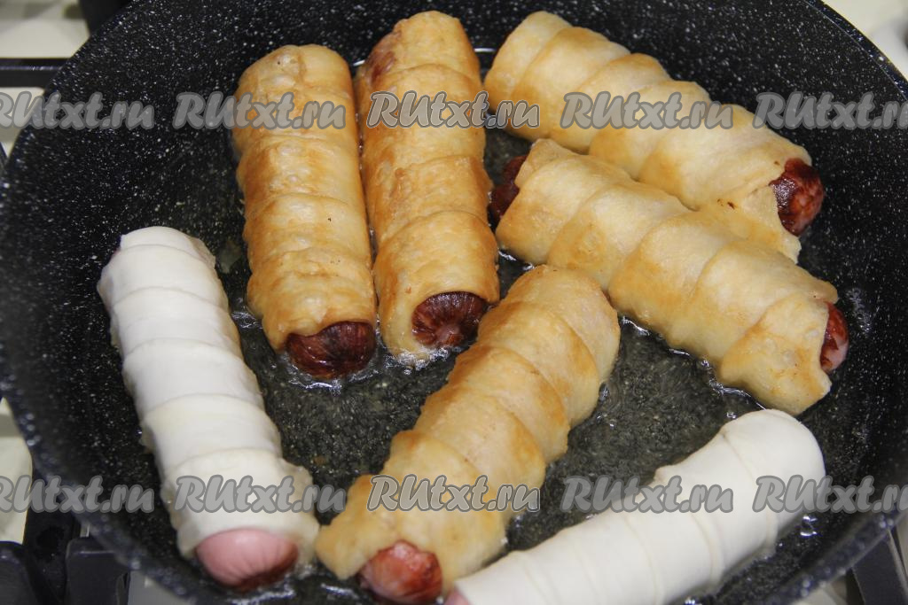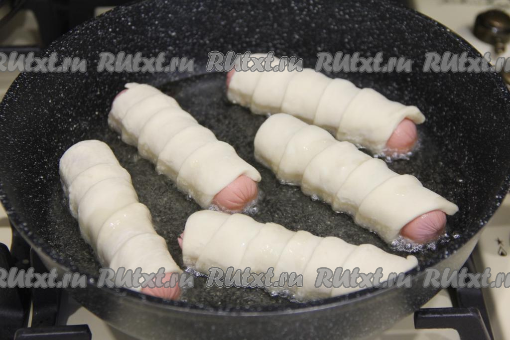 Готовить на среднем огне, периодически переворачивая, чтобы сосиски в тесте прожарились со всех сторон.