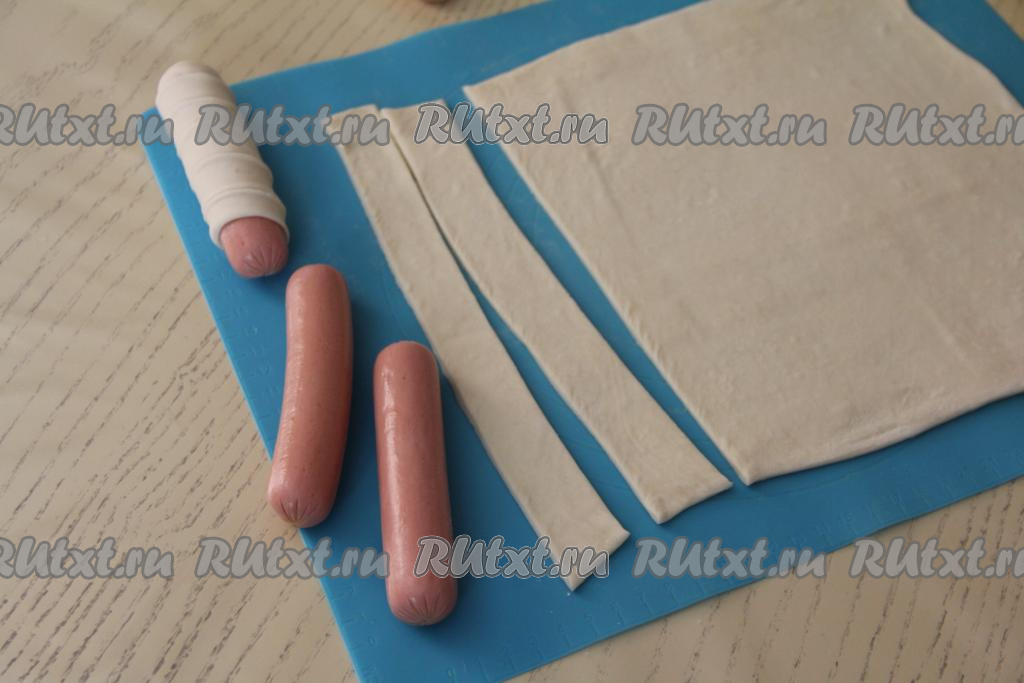 Сосиски очистить от слюды. Нарезать тесто на полоски шириной примерно 1,5 сантиметра.