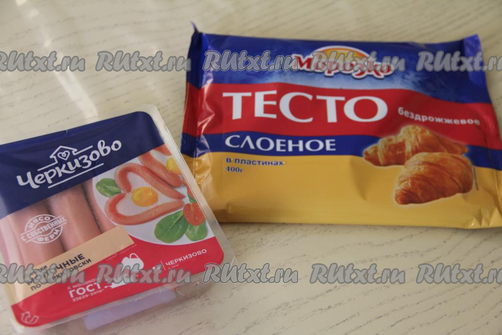 Подготовить продукты. Сосиски выбирайте от проверенного производителя. Слоёное бездрожжевое тесто заранее разморозить при комнатной температуре.