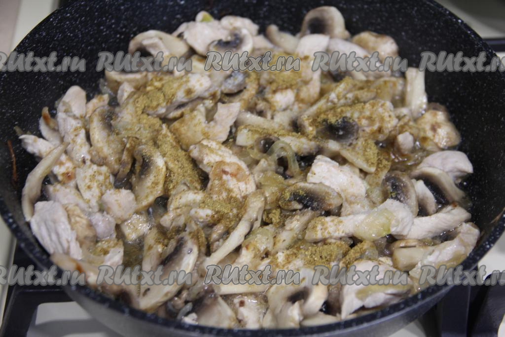 Обжарить курицу с грибами в течение 10-12 минут. В конце жарки посолить по вкусу и добавить любые специи (я всыпала карри), перемешать.