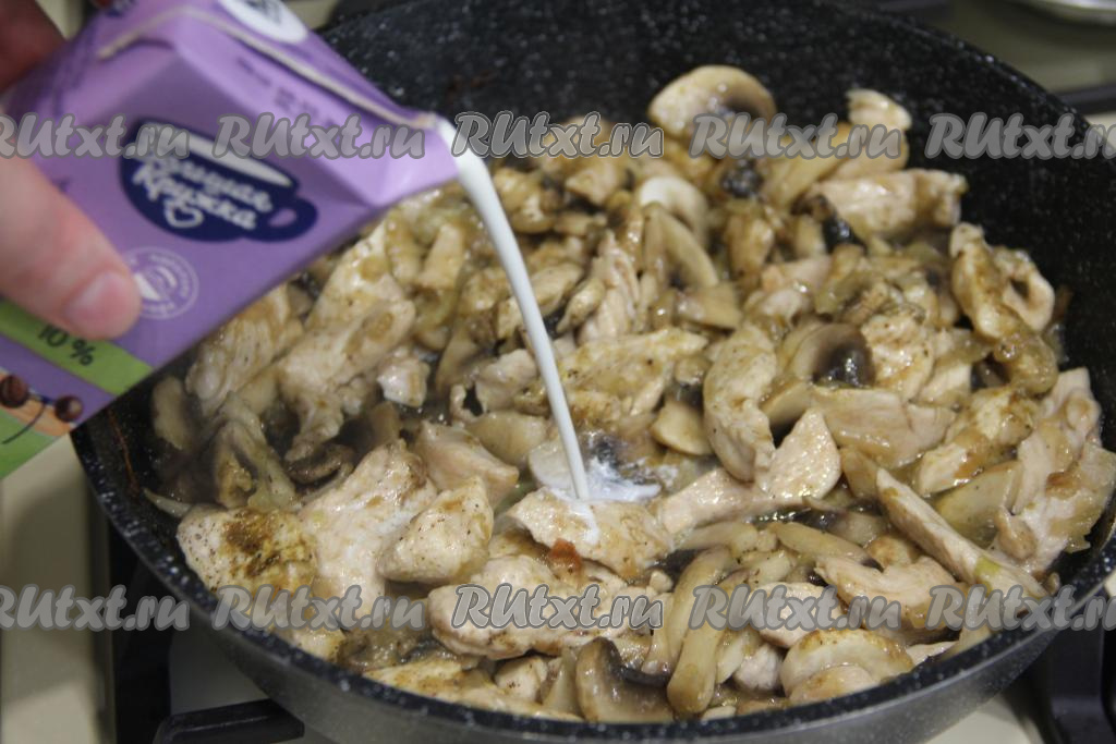 Затем влить в сковороду сливки.