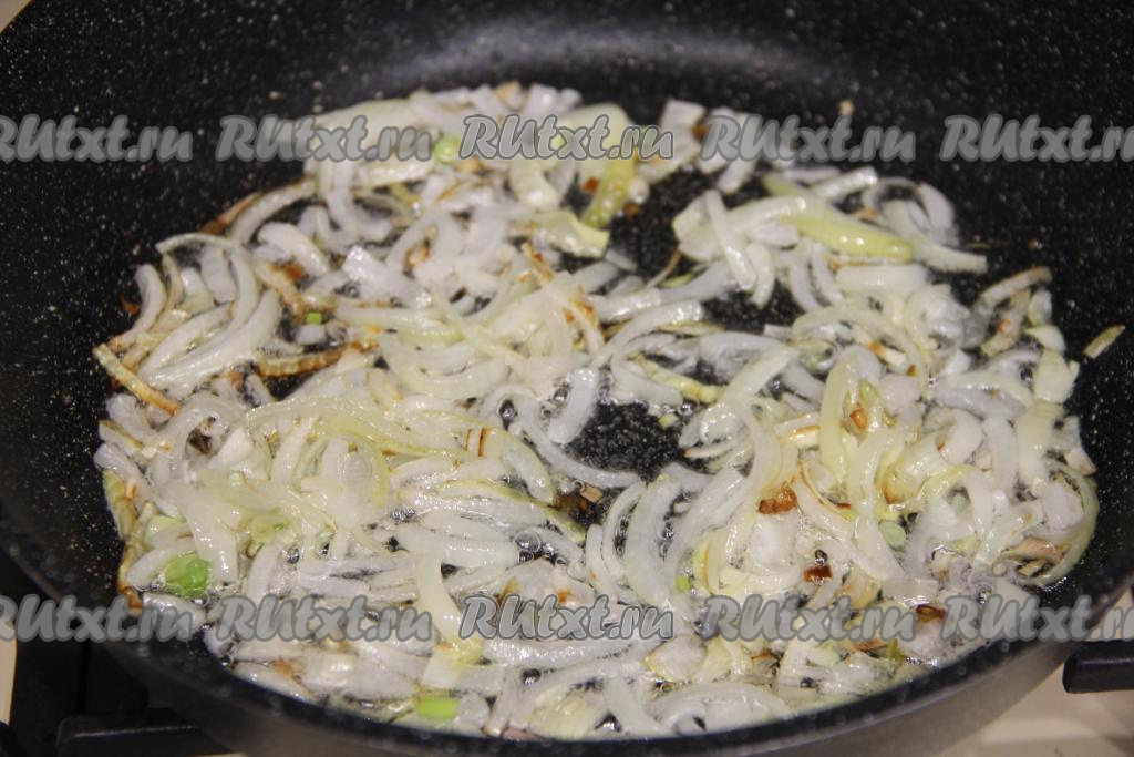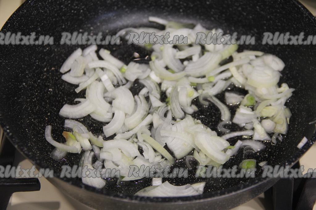 В сковороду влить растительное масло, разогреть, выложить лук, нарезанный на тонкие полукольца (или четверть кольца).