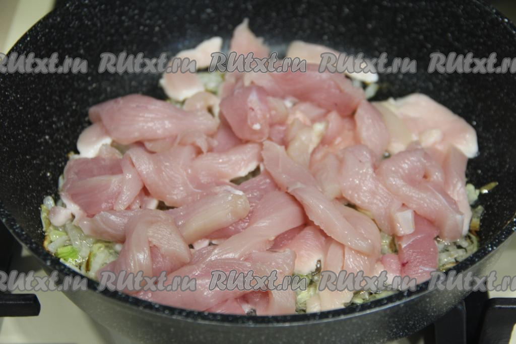 К обжаренному луку добавить куриное филе, нарезанное на брусочки, перемешать.