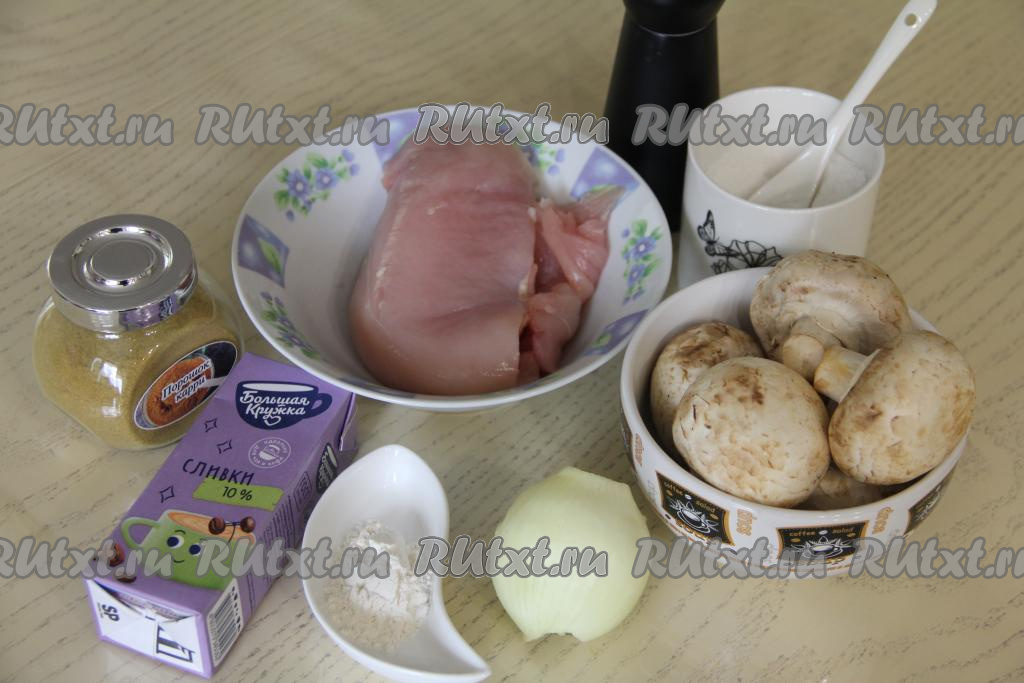 Подготовить продукты. Шампиньоны и куриное мясо промыть водой, обсушить. Лук очистить. Сливки можно взять жирностью от 10% и выше.