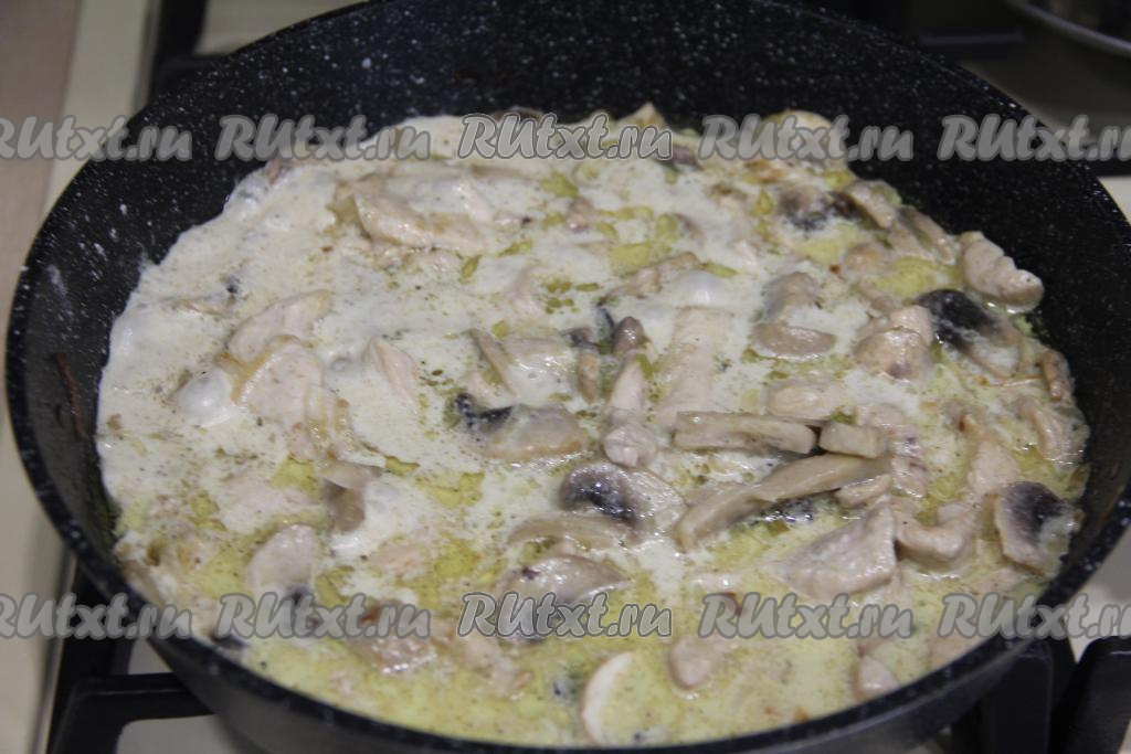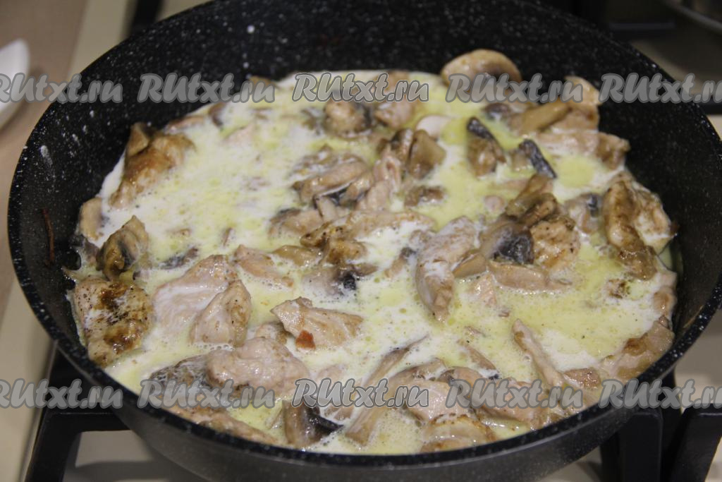 Перемешать, накрыть сковороду крышкой, дать сливкам закипеть, уменьшить огонь до минимума. Попробовать соус на вкус, если нужно, досолить. Томить бефстроганов из курицы с грибами 10 минут, убрать с огня.
