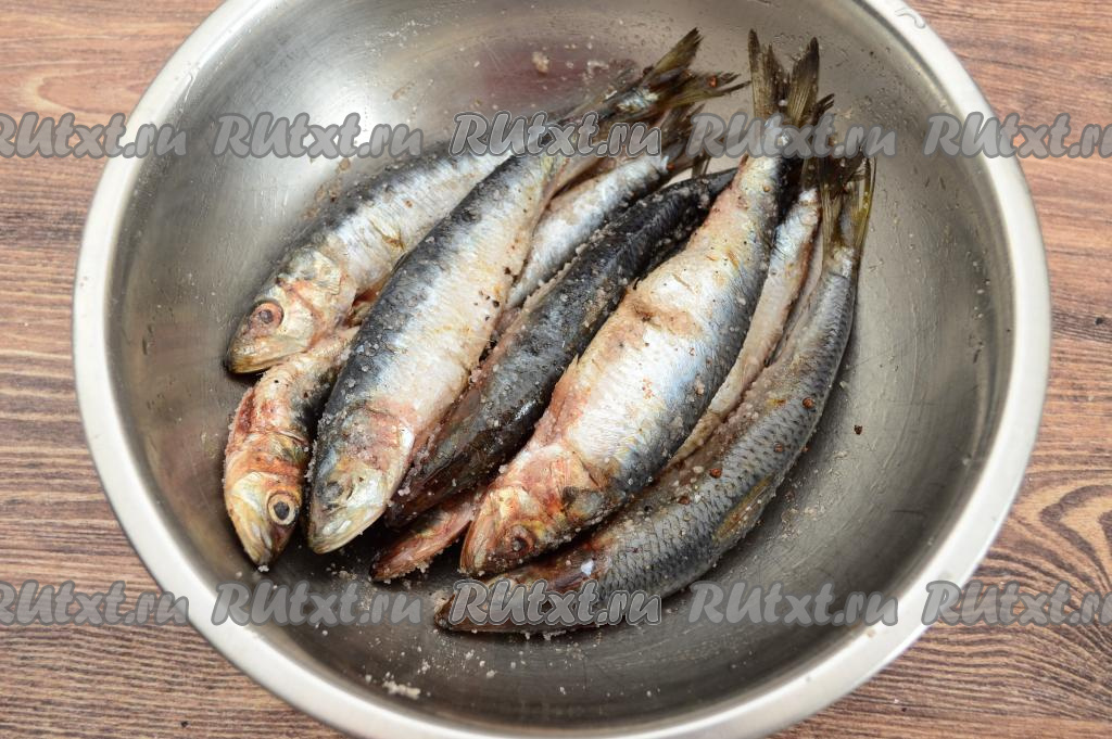 Иваси выложить в глубокую миску. Посыпать рыбку смесью специй, соли и сахара.