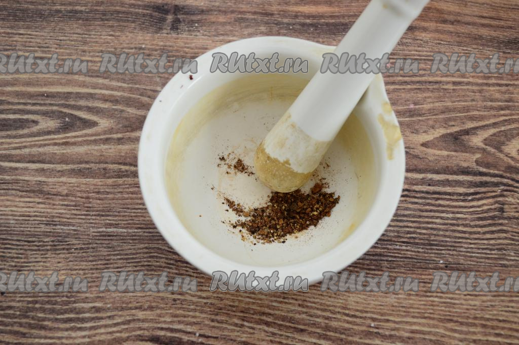 В качестве специй я взяла 5 горошин чёрного и 5 горошин душистого перца. Размяла их в ступке в крошку. Получилось около 0,5 чайной ложки пряных специй.