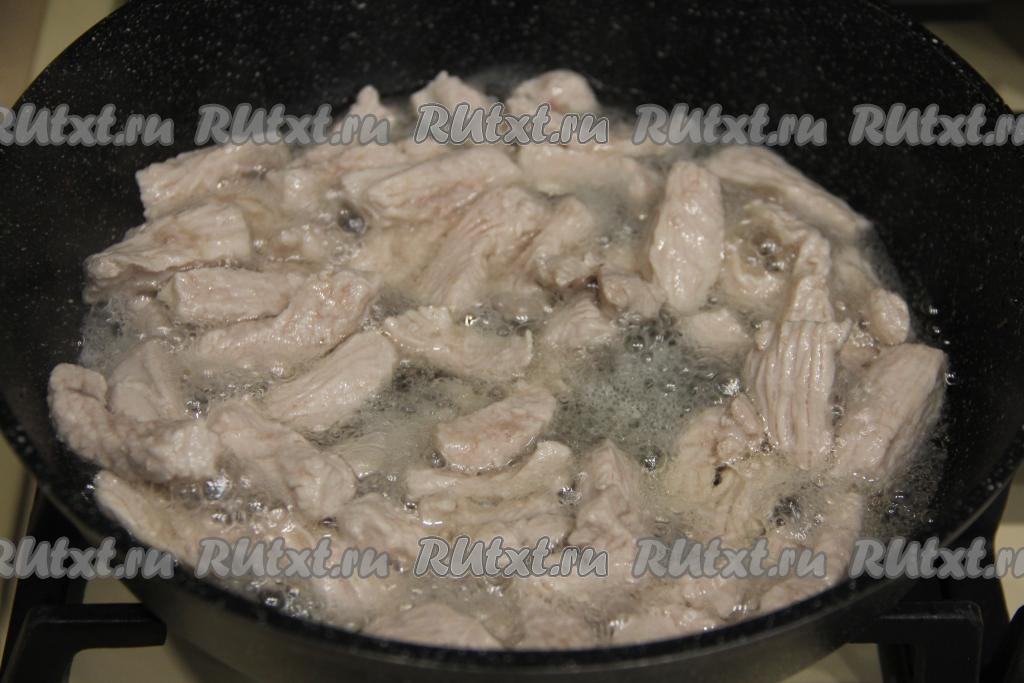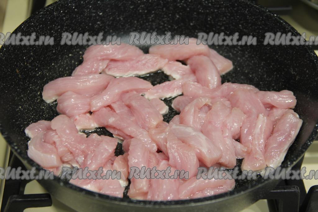 Индейку вымыть, обсушить, нарезать на длинные брусочки, посолить, перемешать. В сковороде хорошо прогреть растительное масло, после этого выложить кусочки индейки.