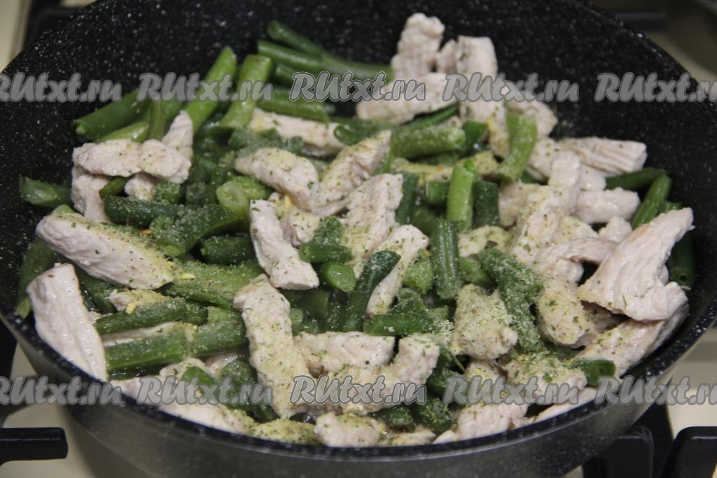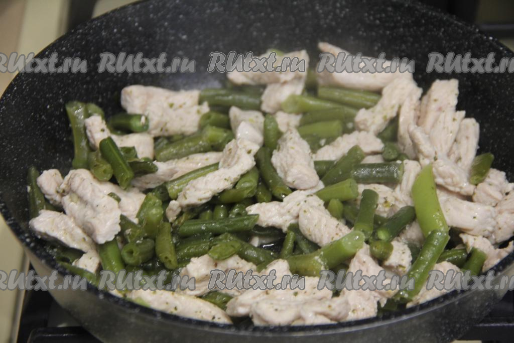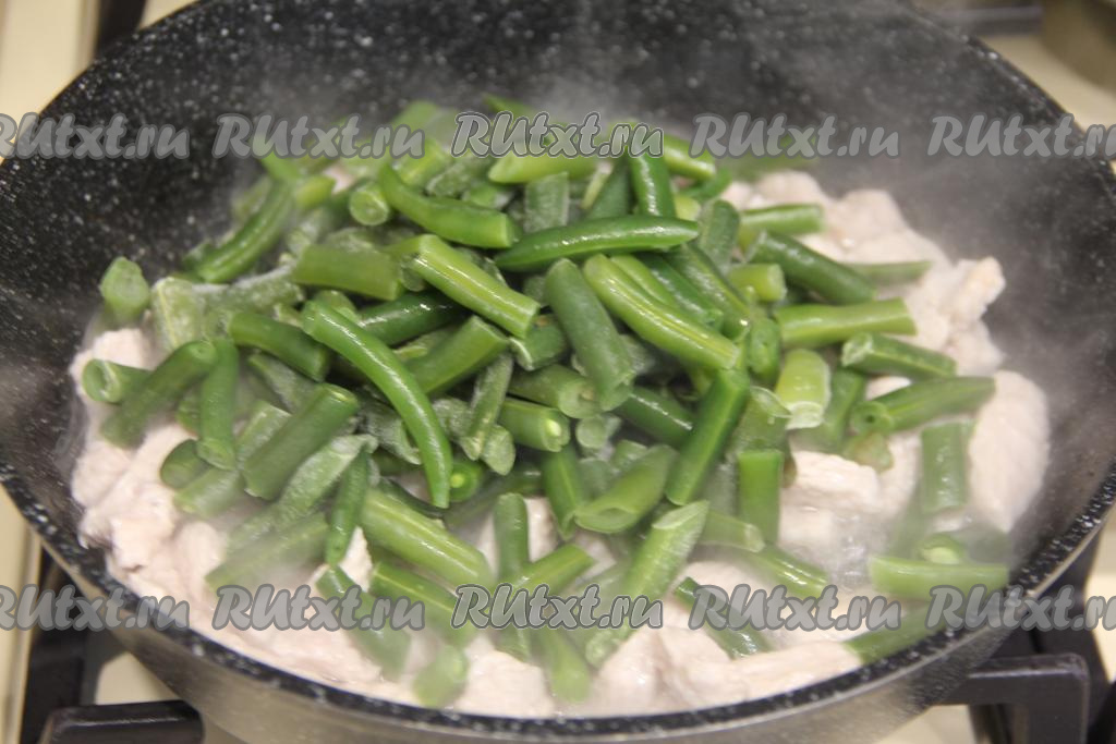 Затем добавить в сковороду замороженную (или предварительно отваренную) стручковую фасоль.