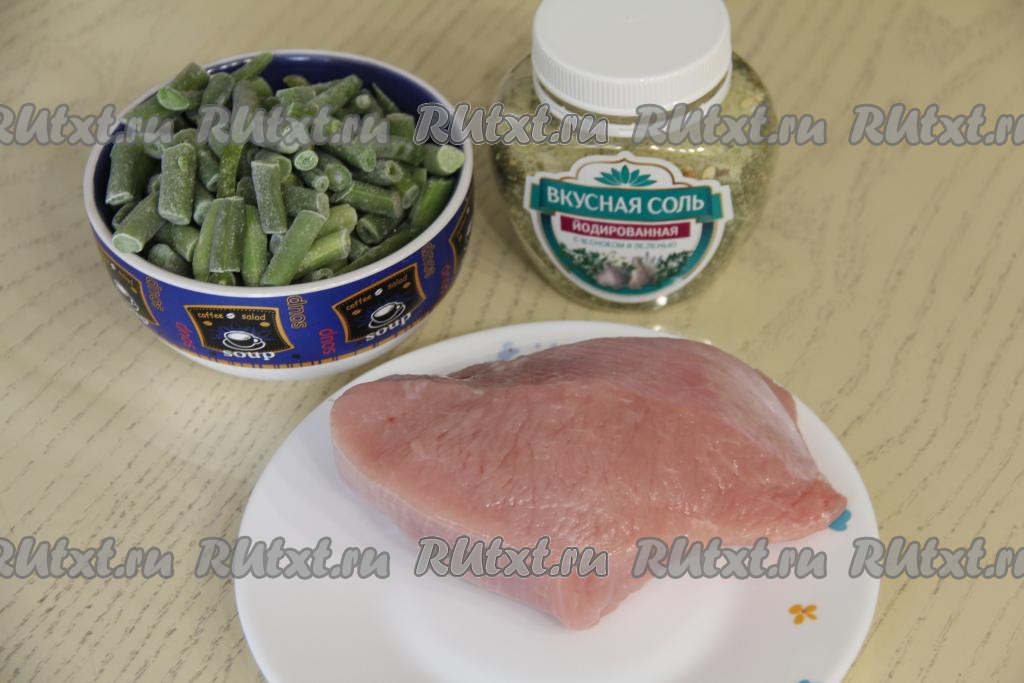 Подготовить продукты. Для этого блюда я использовала филе грудки индейки, но подойдёт и мясо, срезанное с любых частей индейки (например, с голени). Стручковую фасоль я использовала замороженную, размораживать её не нужно. Если же вы будете использовать свежую стручковую фасоль, тогда её нужно промыть водой, отрезать у стручков кончики с двух сторон, после этого выложить фасоль в кастрюлю с кипящей водой и отварить до готовности (в течение минут 5-6 с момента закипания воды, стручки должны стать достаточно мягкими, но хорошо держащими форму), затем воду слить, разрезать каждый стручок на 3-4 части.
