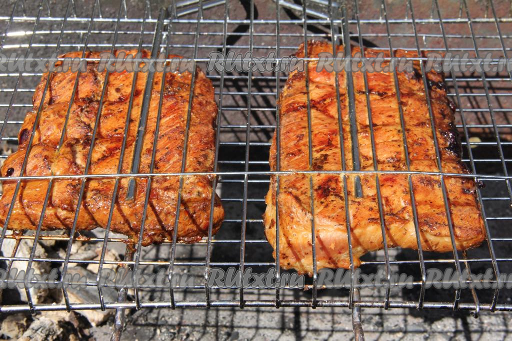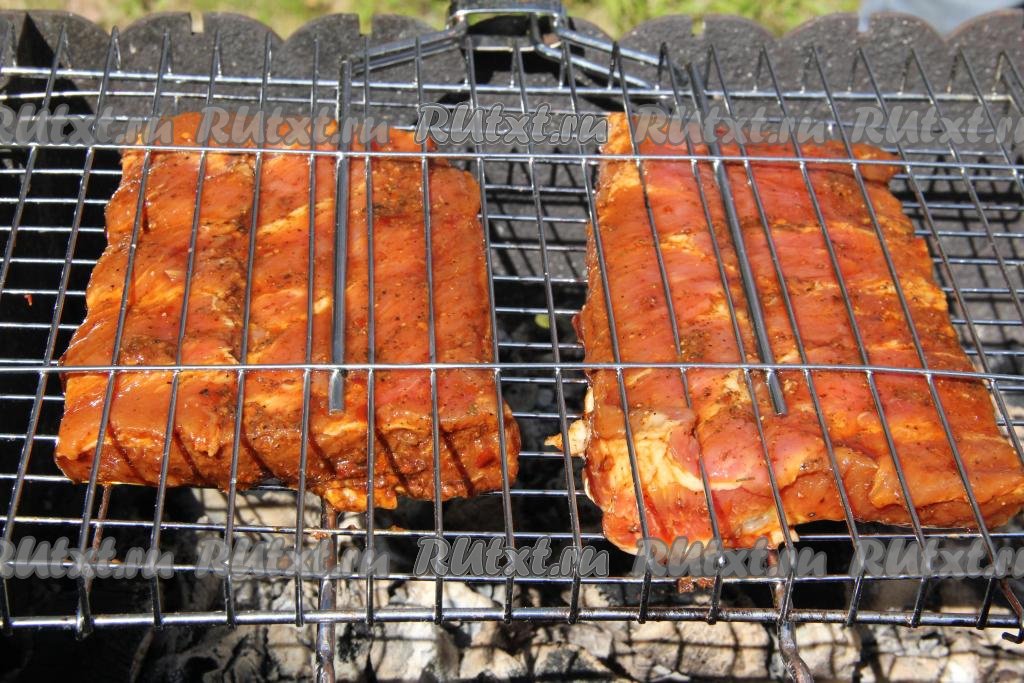 Жарить свиные рёбрышки 20 минут, часто переворачивая решётку и не допуская прямого пламени в мангале, используя только жар углей. Для того чтобы проверить готовность, нужно надрезать мясо, если выделяется прозрачный сок, без примесей крови, значит рёбра готовы.