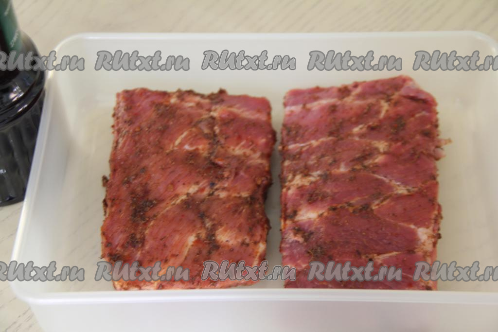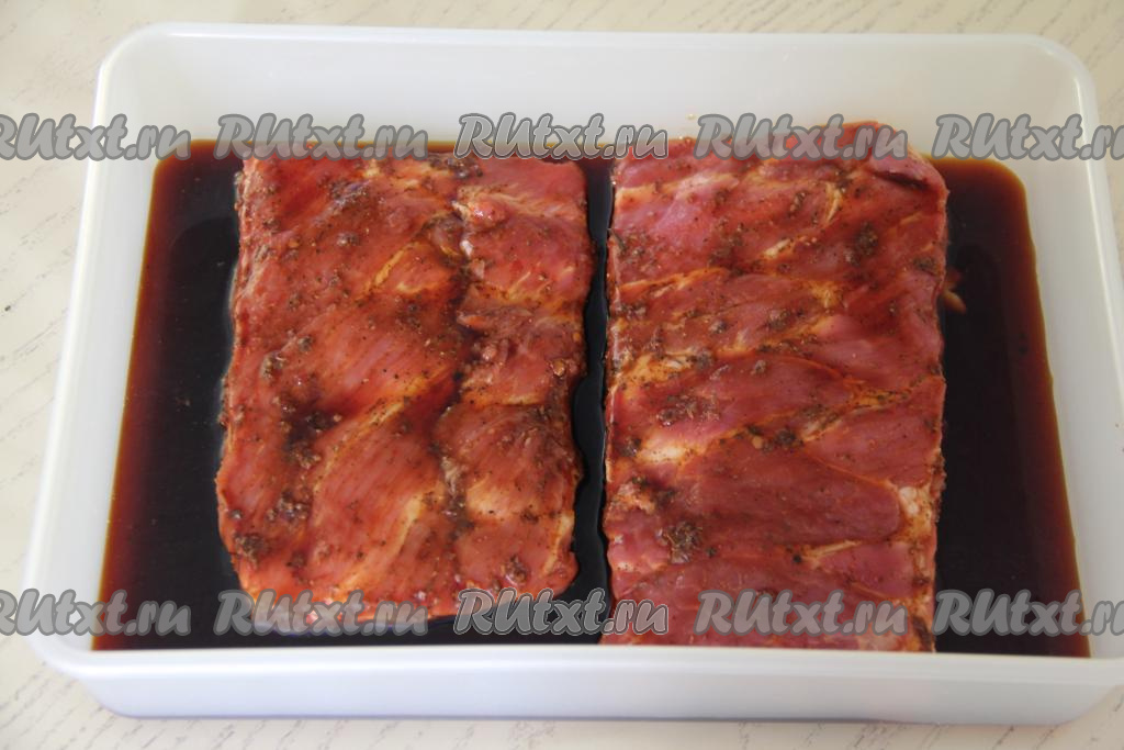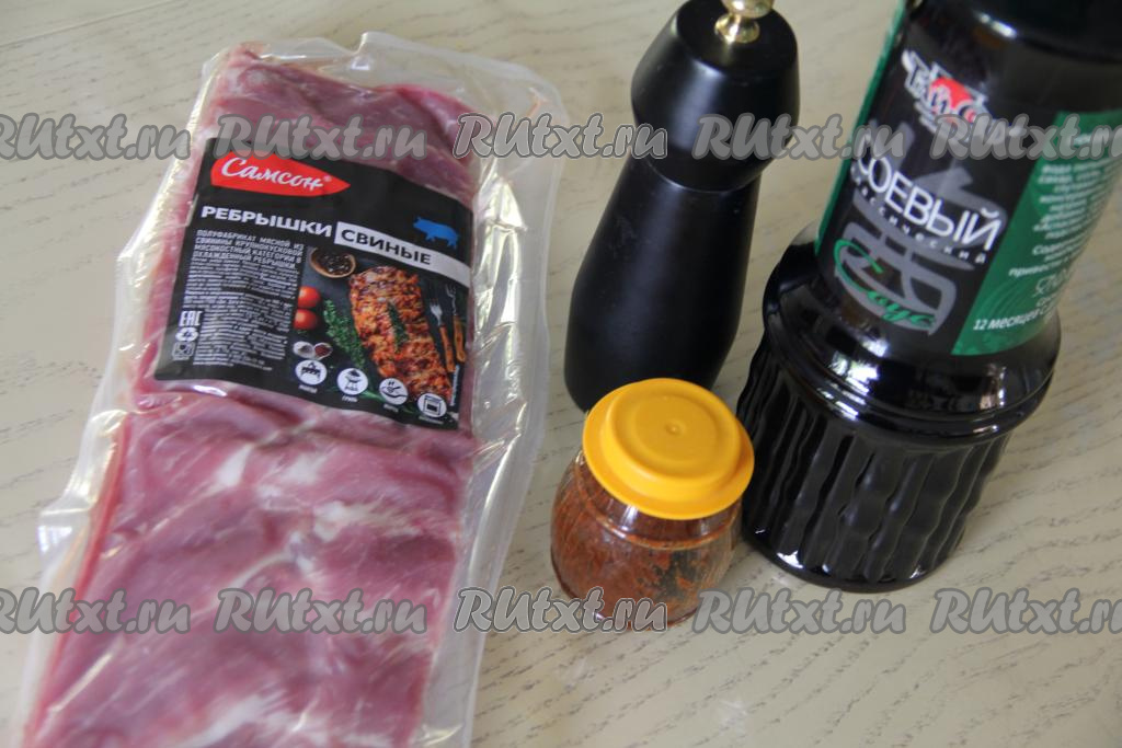 Залить свиные рёбрышки соевым соусом, накрыть крышкой и оставить мариноваться на 2-3 часа в холодильнике (можно оставить мариноваться и на ночь). За это время 2-3 раза рёбра нужно перевернуть, чтобы мясо хорошо промариновалось в соевом соусе со всех сторон. Соль я не добавляла, так как соевый соус достаточно солёный.