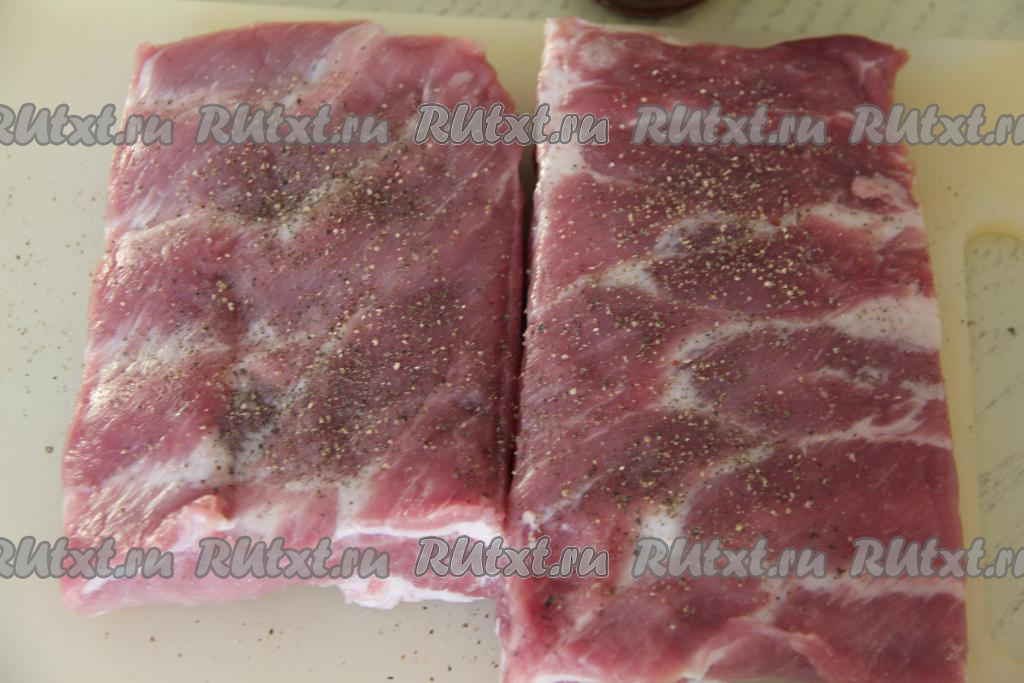 Разрезать свиные рёбра на 2-3 части. Присыпать рёбра молотым чёрным перцем.