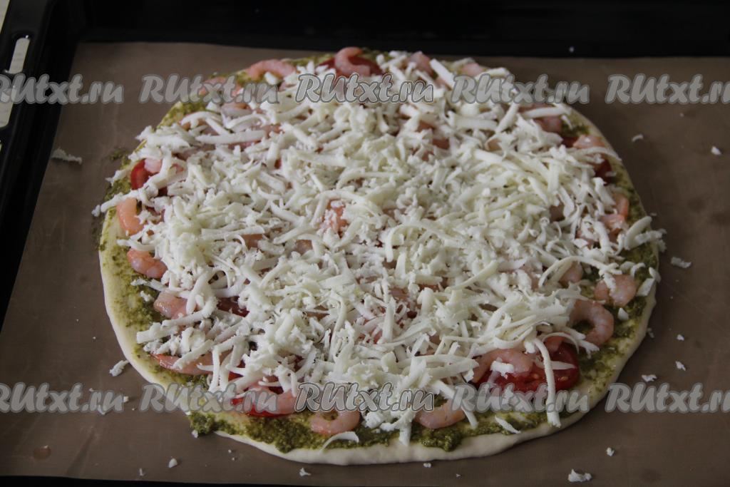 Присыпать пиццу сверху сыром, натёртым на крупной тёрке.