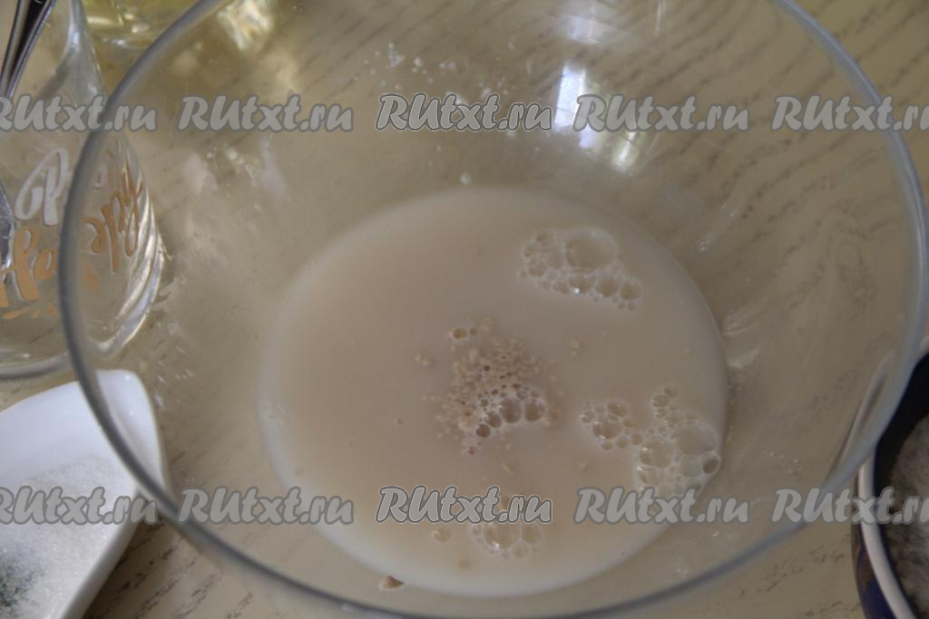 Прежде всего замесим тесто для пиццы, для этого в достаточно глубокую миску нужно всыпать сухие дрожжи, влить тёплую воду (температура воды не должна быть выше 40 градусов, иначе дрожжи погибнут), тщательно перемешать и оставить минут на 10. За это время дрожжи начнут работать и поверхность дрожжевой смеси запенится.