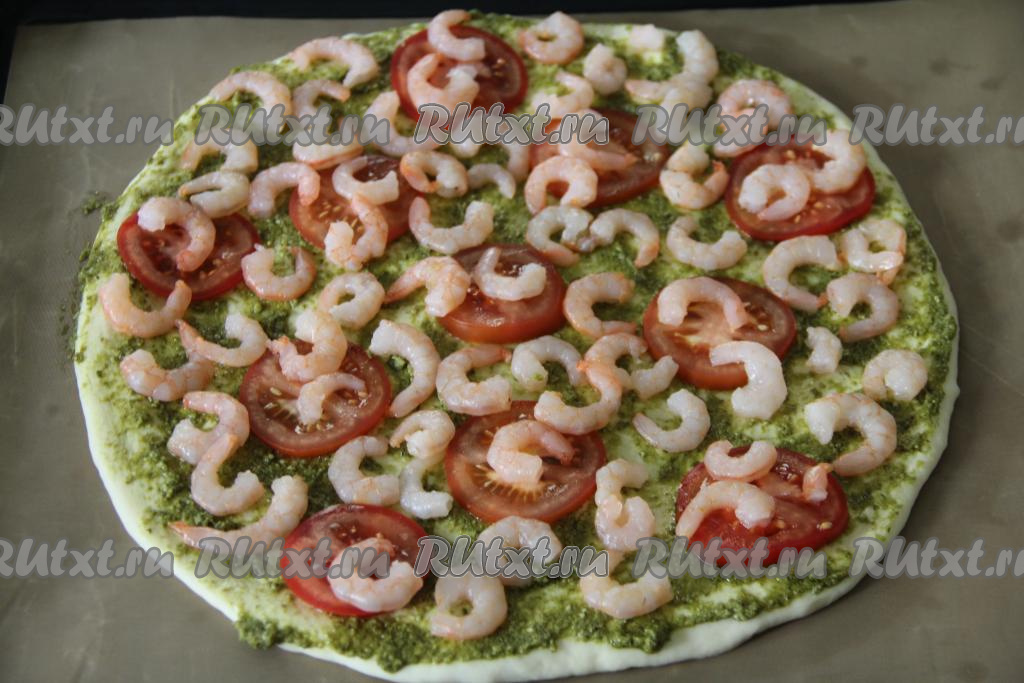 Размороженные креветки, если они не очищены, нужно очистить. Подготовленные креветки выложить на основу для пиццы.