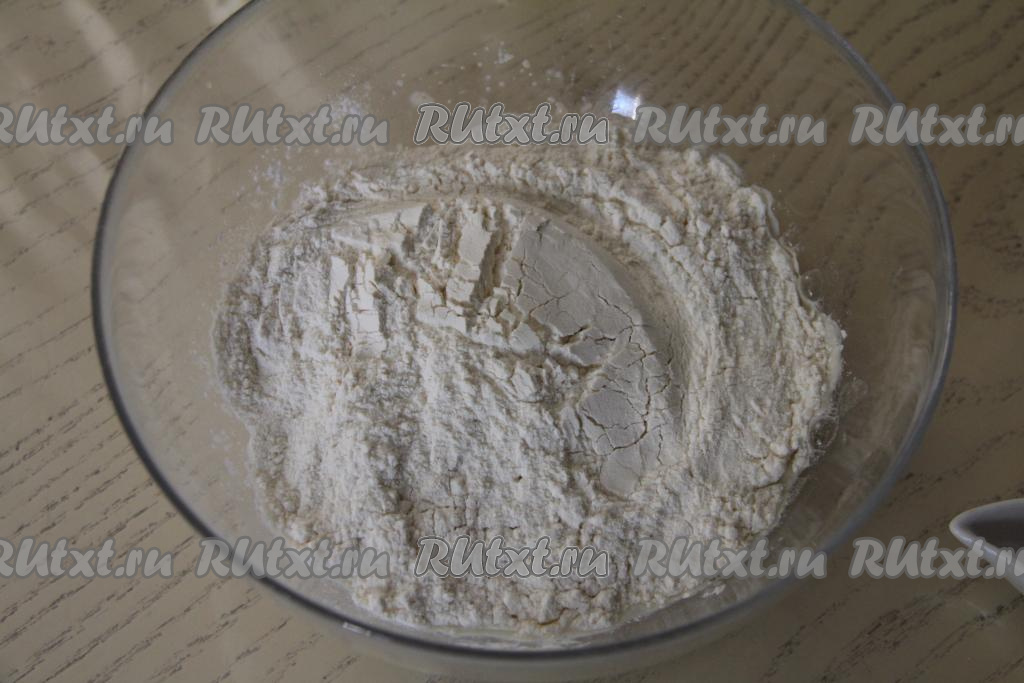 В миску с запенившейся дрожжевой смесью влить растительное масло, всыпать 100 грамм муки, соль и сахар, перемешать столовой ложкой. Постепенно начать всыпать оставшуюся муку, каждый раз хорошо вмешивая её. После того как в процессе добавления муки перемешивать тесто ложкой станет сложно, продолжать замешивать его руками.