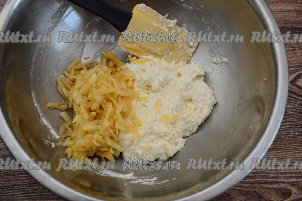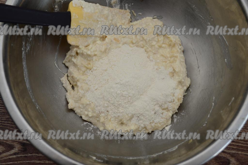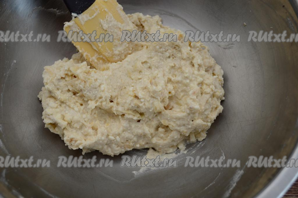 Мне всего потребовалось добавить 50 грамм муки, возможно, вам понадобится чуть меньше или чуть больше муки, так как количество муки, которое придётся добавить, зависит от влажности творога, сочности и размера яблока.