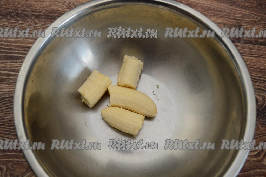 Банан очистить, разломать на кусочки, выложить в глубокую миску.
