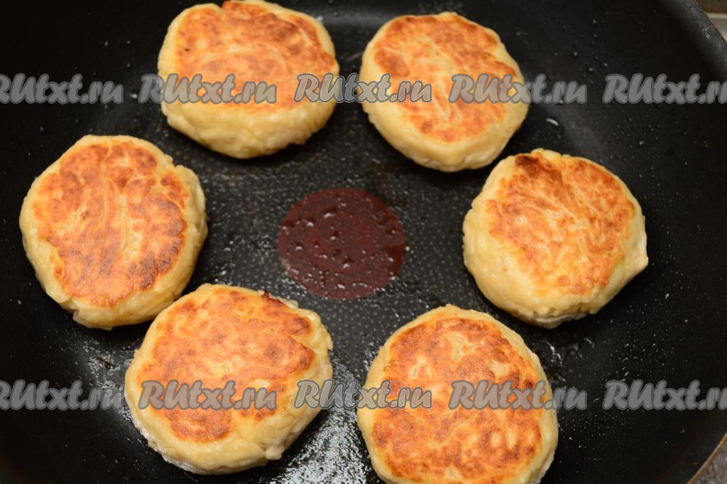 Жарить сырники на среднем огне до приятного подрумянивания с двух сторон (ориентировочно по 3 минуты с каждой стороны). Затем выключить огонь, ещё раз перевернуть сырники и, накрыв сковороду крышкой, дать им пропариться в течение 5 минут.