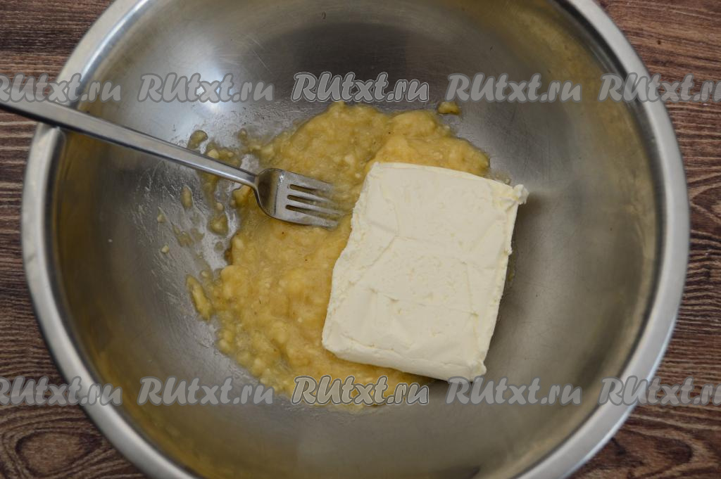 Добавляя понемногу муку, обязательно учитывайте, что итоговое тесто для сырников с бананом и яблоком должно быть липким, но при этом, если его слегка сжать в руке, оно должно держать форму.