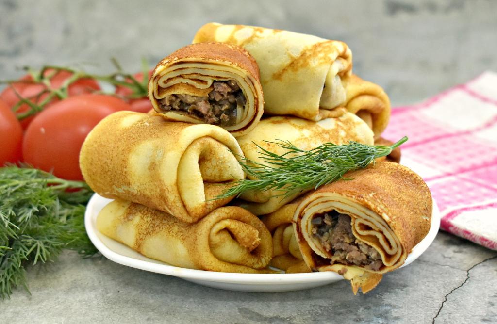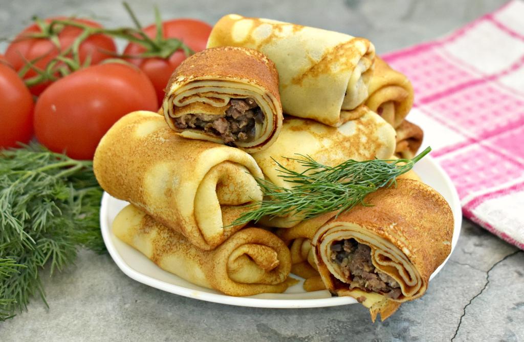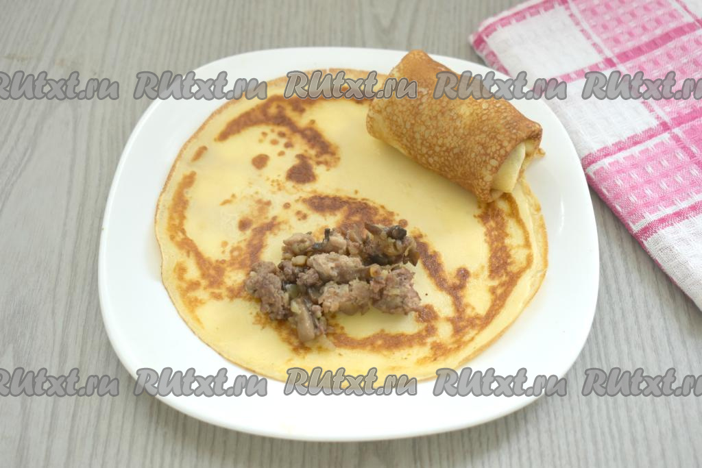 В моей семье очень любят фаршированные блины. В этот раз решила приготовить тонкие, аппетитные блины с нежной начинкой из фарша и грибов. Фаршированные блинчики получились вкусными, сытными, ароматными. Такие блинчики идеально подойдут к семейному обеду или ужину.