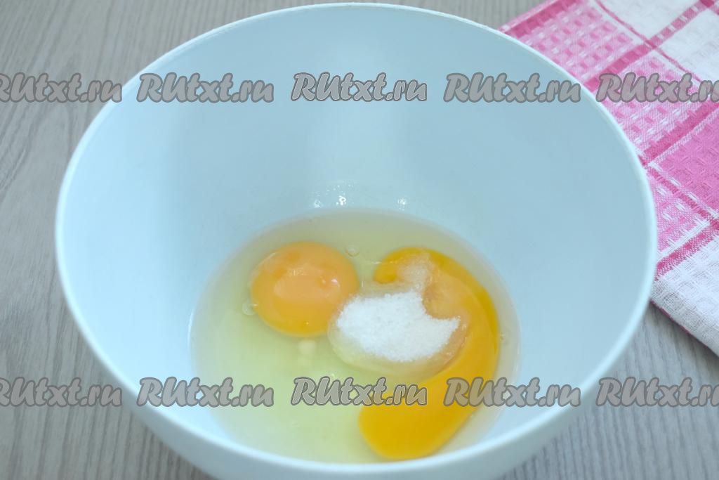 Прежде всего замесим блинное тесто, для этого в достаточно объёмную миску разбиваем яйца, добавляем к ним сахар и соль, перемешиваем венчиком в течение 2-3 минут.
