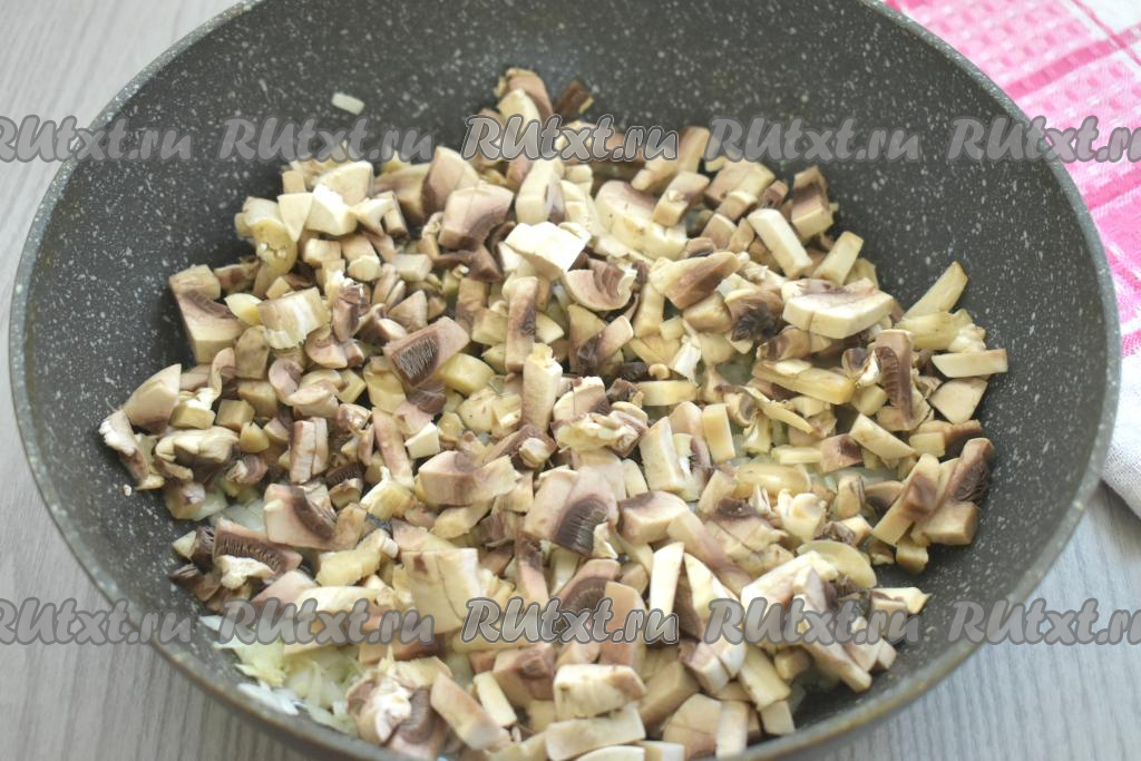 К обжаренному луку выкладываем нарезанные на небольшие кубики шампиньоны (или нарезанные на небольшие части лесные грибы), перемешиваем, обжариваем минут 5, не забывая время от времени перемешивать.
