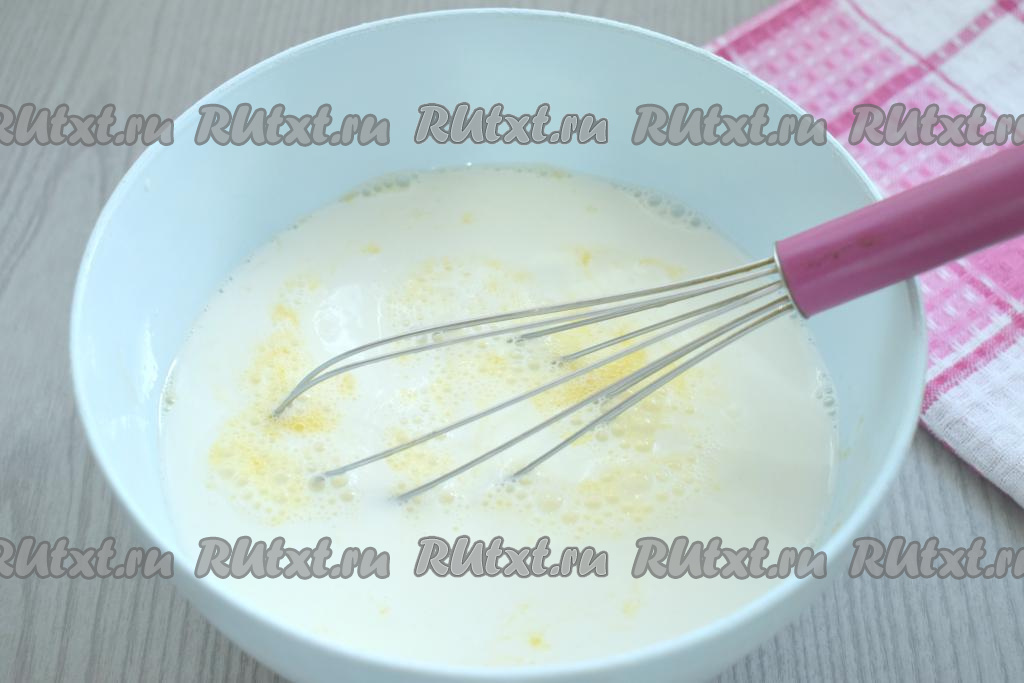 Молоко подогреваем на плите до комнатной температуры. В получившуюся яичную смесь вливаем молоко, перемешиваем венчиком до однородности.
