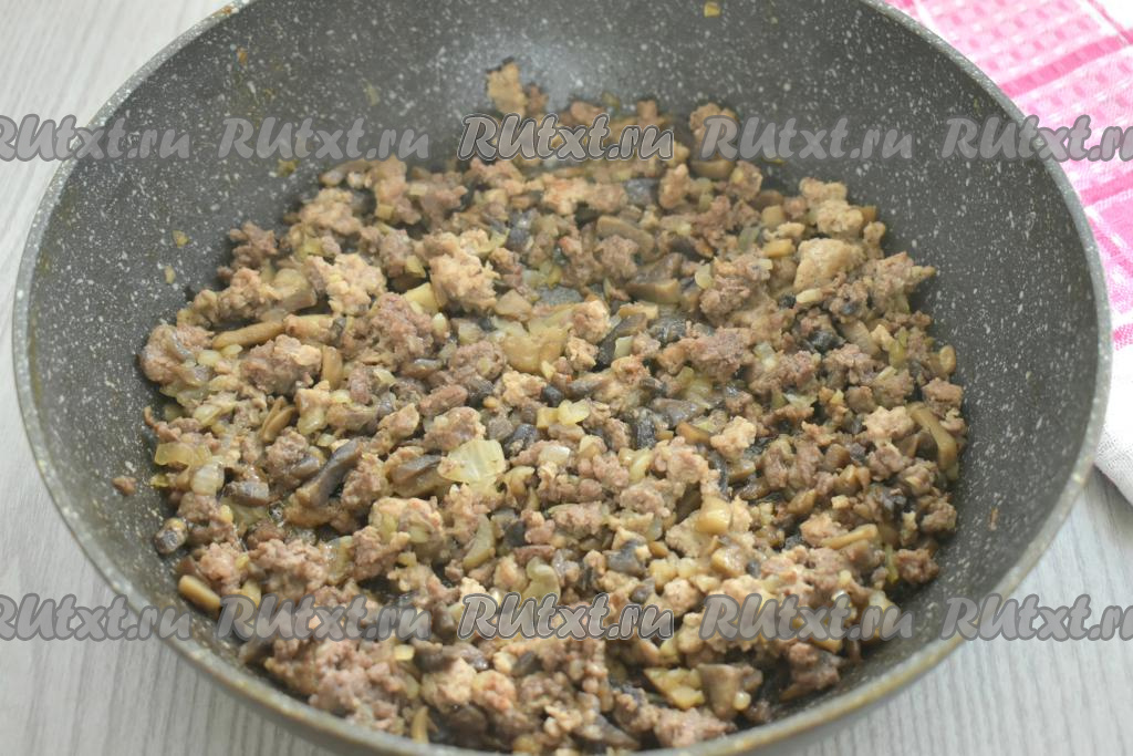 К грибам, обжаренным с луком, добавляем мясной фарш (фарш можно взять любой: из свинины, говядины, курицы, индейки или смешанный), по вкусу солим, приправляем любимыми специями, часто перемешивая и разбивая кусочки фарша, обжариваем минут 10-15. Убираем с огня и начинка для блинов готова.