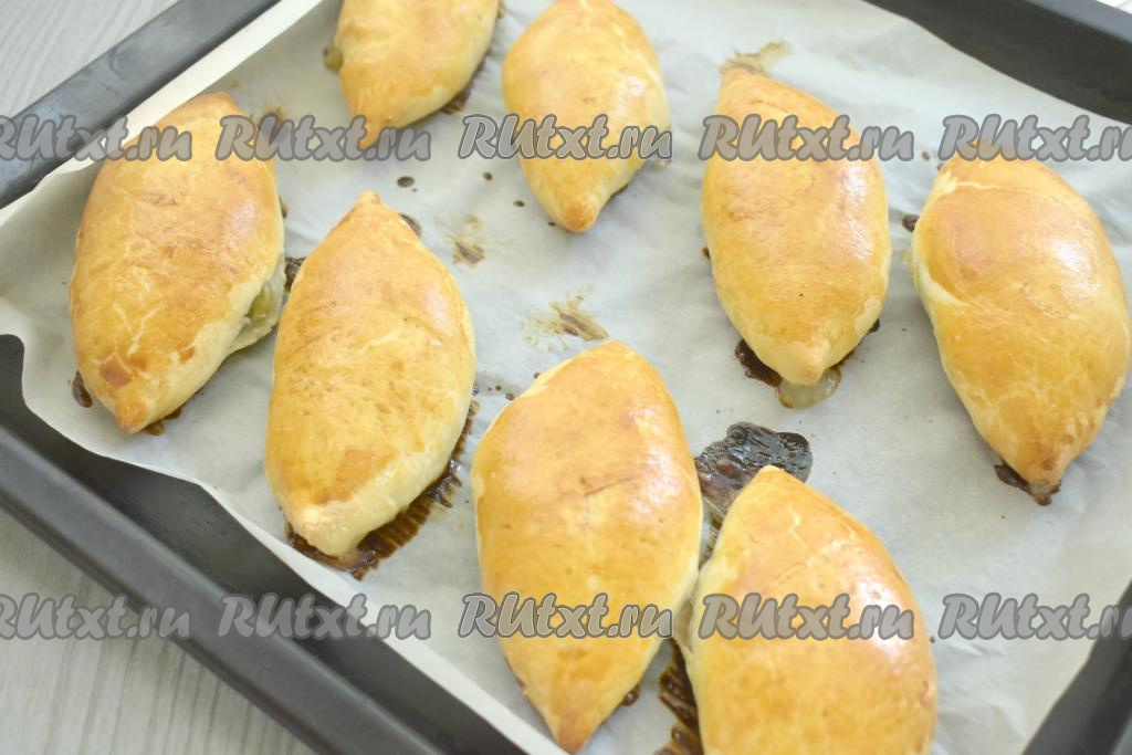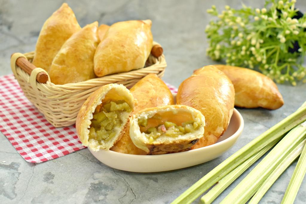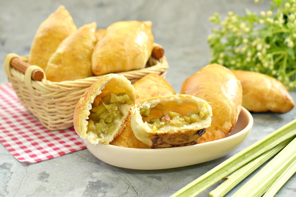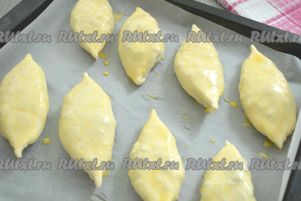 Отправляем пирожки с ревенем в духовку, прогретую до 200 градусов, на 20-25 минут (до подрумянивания слоёного теста).