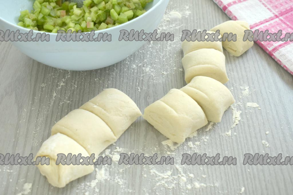 Количество сахара можно варьировать в зависимости от ваших предпочтений. Я добавила 3 столовых ложки сахара, пирожки получились в меру сладкими, с приятной кислинкой. Крахмал добавляется для того, чтобы сок из ревеня не вытекал в процессе выпечки. Именно благодаря крахмалу начинка получится более густой и насыщенной.
